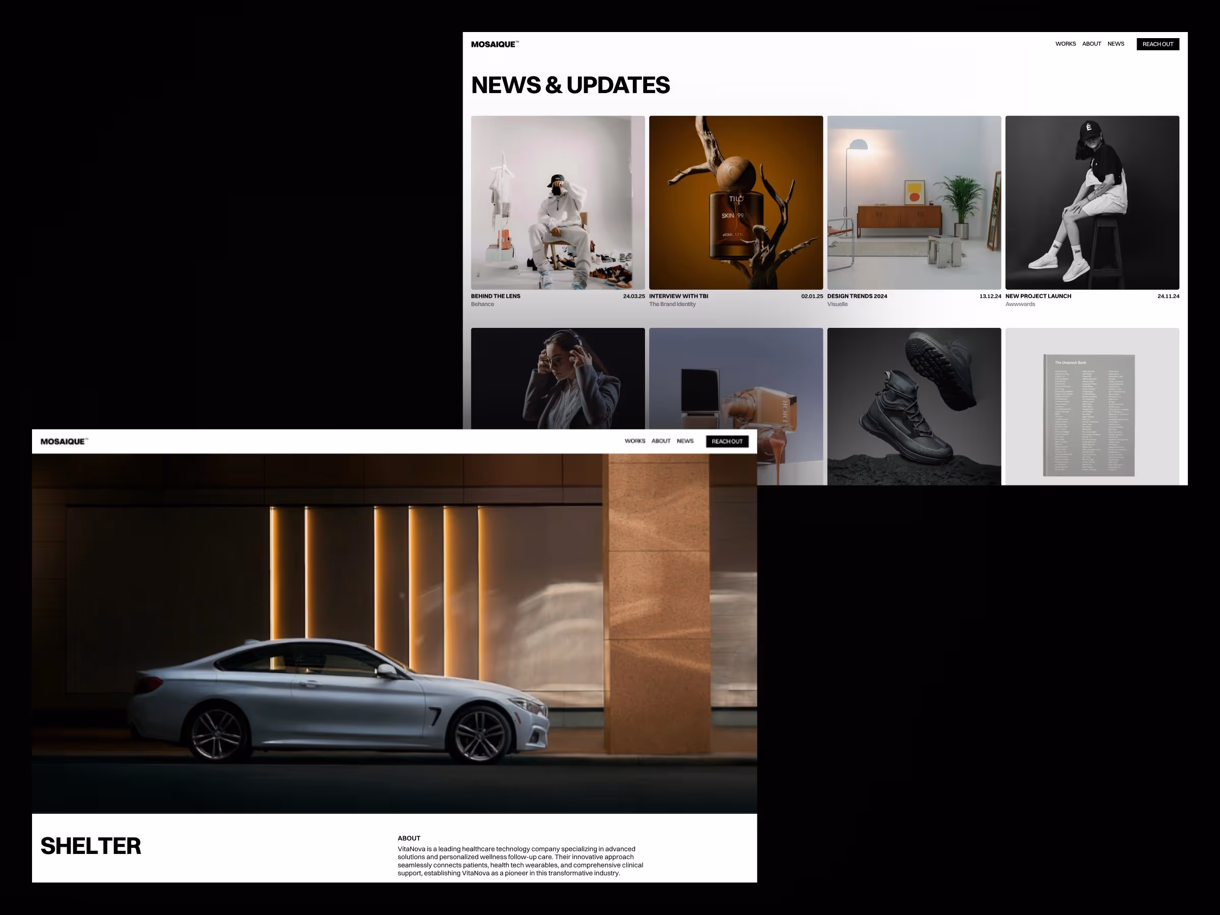 Perfect for freelancers, design studios, and agencies, Mosaique combines simplicity with professionalism. The built-in CMS makes it easy to update case studies, add new projects, and keep your portfolio fresh. Subtle transitions and a seamless flow give visitors a smooth browsing experience, while responsive layouts guarantee your work looks sharp across all devices.